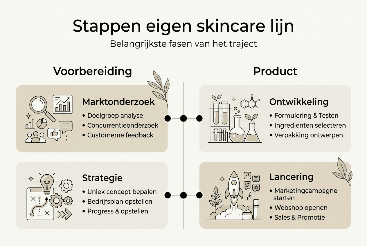 Voordat u begint met productontwikkeling, is het cruciaal om uw strategie en doelgroep scherp te hebben. Het ontwikkelen van een skincare lijn via private label bestaat uit vijf tot zes essentiële fasen. Elke fase vraagt om specifieke kennis en voorbereiding. Zonder heldere visie op uw niche en doelgroep riskeert u een generiek product dat niet opvalt.