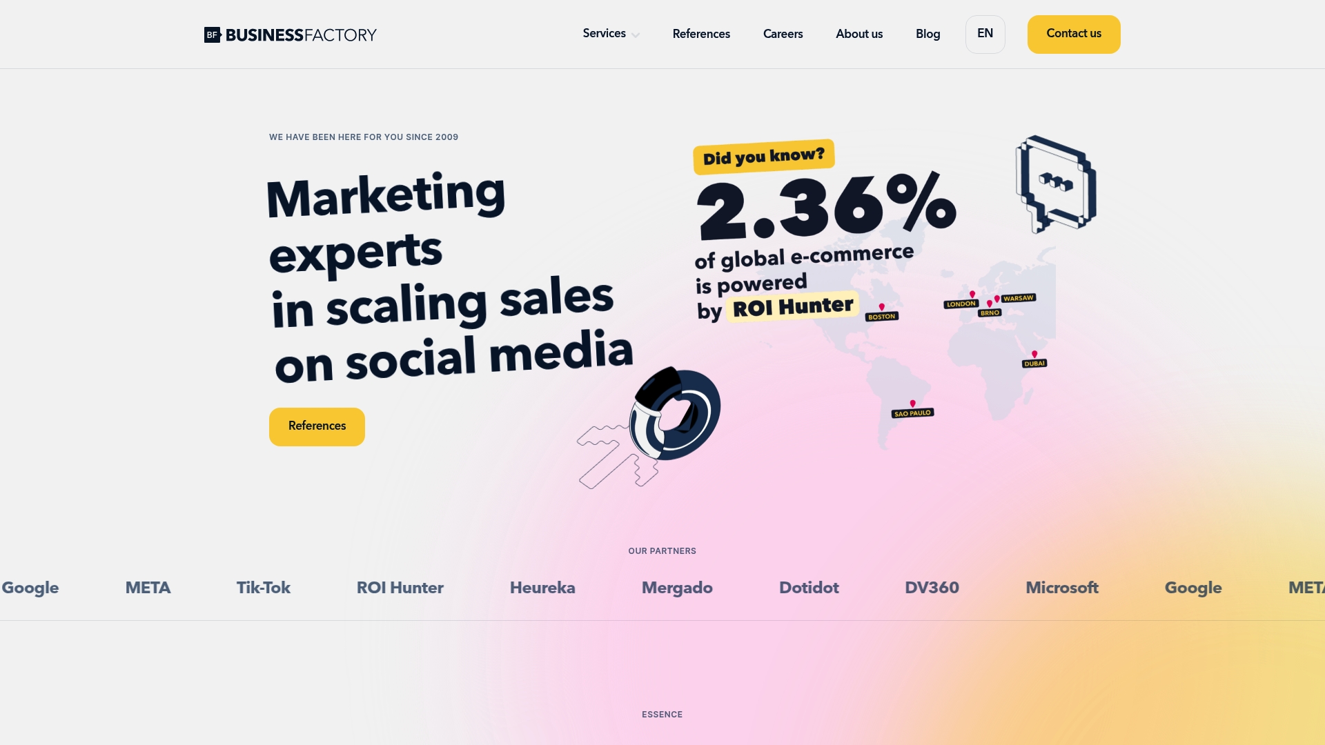 Business Factory is een internationaal resultaatgericht marketingbureau dat sinds 2009 schalen van sales op sociale media realiseert voor e‑commerce merken. De aanpak is sterk datagedreven en gericht op directe koppeling tussen advertenties en echte verkoopdata.