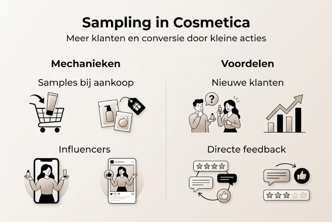 Wist je dat 85% van samplers grote kans heeft om daarna een full-size product te kopen? Voor beautymerken die net van start gaan, is dit geen luxe gegeven maar een concrete groeistrategie. Sampling werkt niet alleen als marketingmiddel maar als directe brug tussen jouw product en een potentiële vaste klant. In dit artikel lees je wat sampling precies inhoudt, welke mechanieken het beste werken voor startende cosmeticamerken, en hoe je stap voor stap een campagne bouwt die écht resultaat oplevert. Na het lezen ga je anders naar je productlijn kijken.