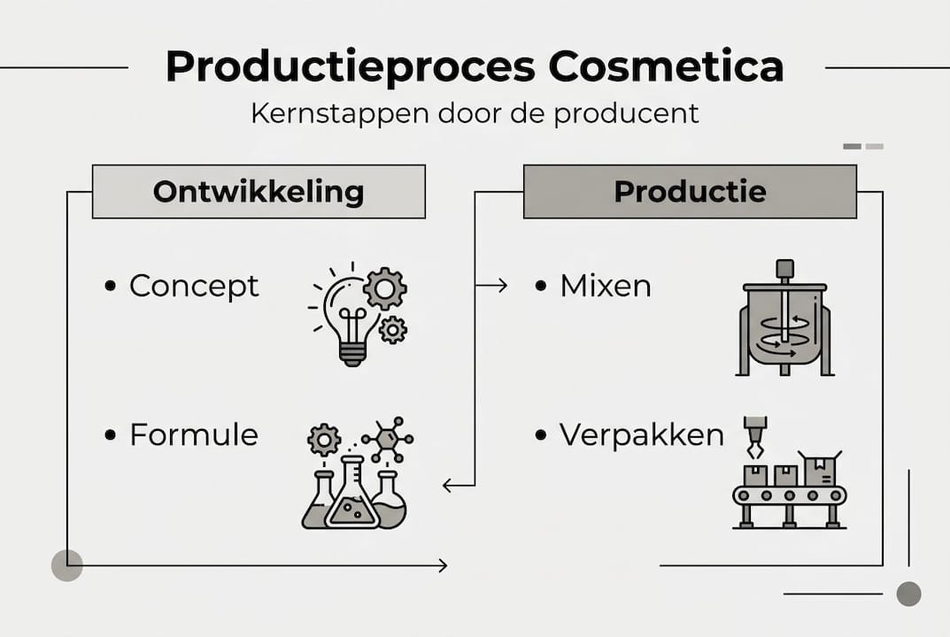Pro-tip: Vraag bij een eerste gesprek altijd naar de GMP-certificering van de producent. GMP staat voor Good Manufacturing Practice en is de Europese norm (ISO 22716) voor hygiënische en gecontroleerde productie. Zonder GMP riskeer je producten die de markt niet op mogen.